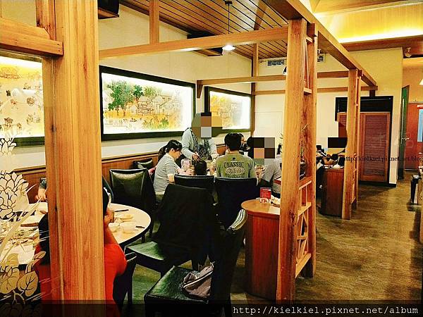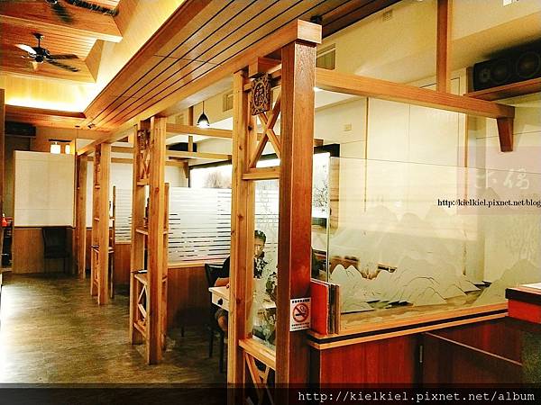 店內設計也以中式木造裝飾,做出柱、梁、枋等結構,區分大圓桌區及四人桌,四人桌也有半隔間可以選擇。